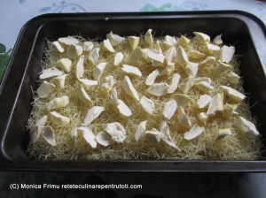 Punem jumătate din tăiței într-o tavă, deasupra jumătate de unt tăiat bucățele.