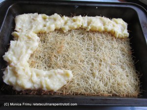 Prăjim în același mod restul de tăiței, răcorim, turnăm siropul rămas, punem deasupra cremei și peste presărăm fistic mărunțit. Nu am avut fistic și am presărat nucă caramelizată. Porționăm în tavă și servim călduț/rece.