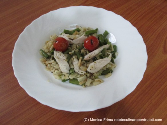 – 200 g piept de pui dezosat și fără piele, 200 g tăiței din clătite (din comerț), 2 fire usturoi verde, 400 g fasole verde congelată, 2 lingurițe cimbru uscat, 8-10 roșii Cherry, 2 linguri ulei, sare, piper, apă