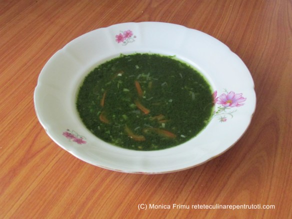 – 500 g spanac, 3 cepe verzi, 2 ardei grași roșii, 1 cub concentrat supă de legume, 1 l apă, sare, piper