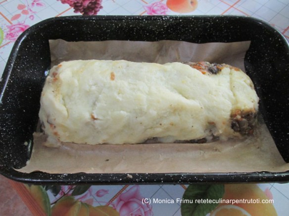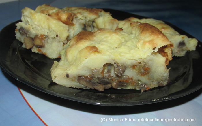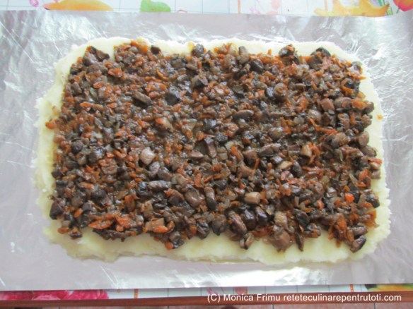Curățăm și tăiem ceapa mărunt, ciupercile bucățele, morcovii radem mare. În uleiul încins călim ceapa și morcovii 1 min. Adăugăm ciupercile, măghiranul, 1 linguriță sare, 1 linguriță piper negru măcinat, amestecăm bine și ținem pe foc mediu până se evaporă lichidul. Curățăm cartofii, tăiem bucăți, fierbem în apă cu 1 linguriță de sare până se înmoaie. Dizolvăm amidonul în puțină apă. Scurgem cartofii bine, pasăm, amestecăm cu amidonul dizolvat și sare după gust. Întindem pe o folie de aluminiu sub formă de dreptunghi. Acoperim suprafața cu ciupercile.