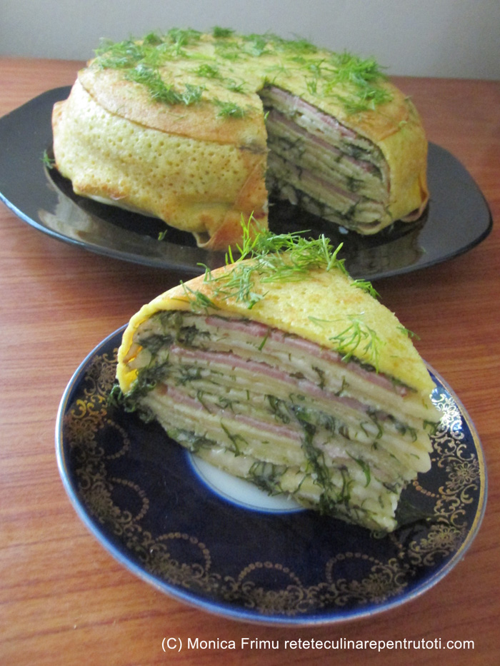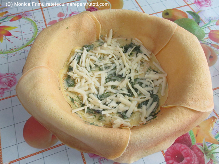 Repetăm operațiile până umplem Yena. Întoarcem clătitele de pe margini astfel încât să acopere budinca. Ungem suprafața cu smântână. Punem în cuptorul preîncălzit, la foc mai mare (200), aprox. 25 min., până se rumenește ușor. Răcorim 10 min., răsturnăm pe un platou și presărăm frunze de mărar. Porționăm și servim. Se poate consuma și rece.