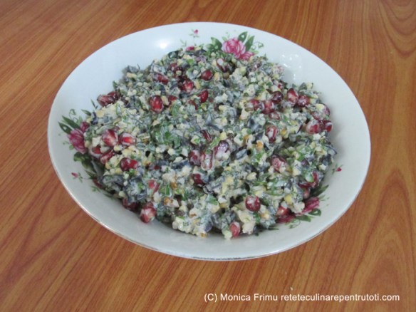 Tăiem nucile cu cuțitul. Zdrobim boabele de piper mai mare. Tăiem mărunt menta, pătrunjelul, măslinele, le amestecăm într-un bol cu semințele de rodie, arahidele, nucile și migdalele. Batem bine iaurtul cu sarea. Încălzim uleiul, prăjim piperul 30 secunde, turnăm iaurtul și amestecăm bine 30 secunde. Turnăm în bol, amestecăm bine și servim. Putem păstra în frigider.