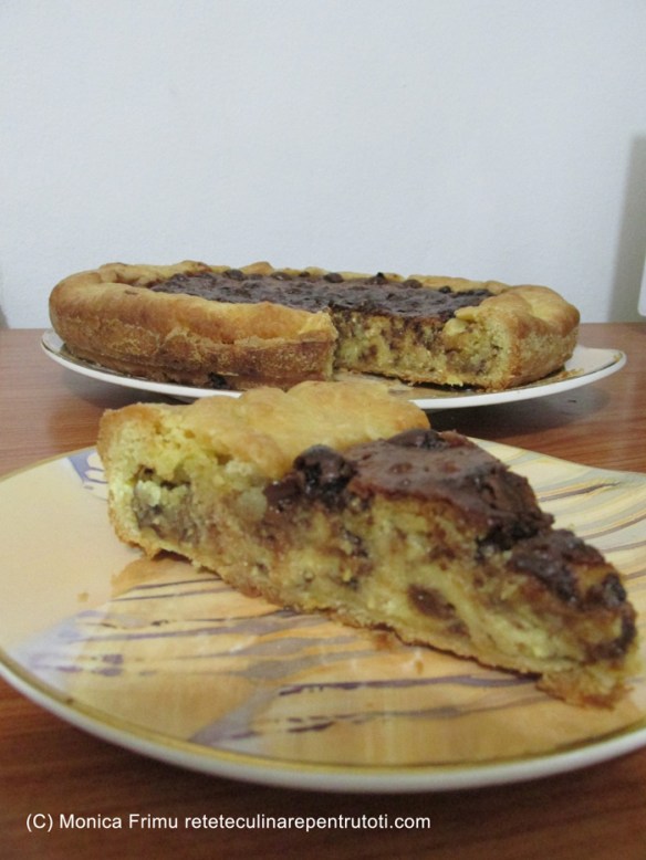 Punem în cuptorul preîncălzit, la foc mediu, aproximativ 1 oră (testul cu scobitoarea). Stingem focul, lăsăm tarta în cuptorul cald 10 min. apoi răcim. Scoatem pe un platou, porționăm și servim.