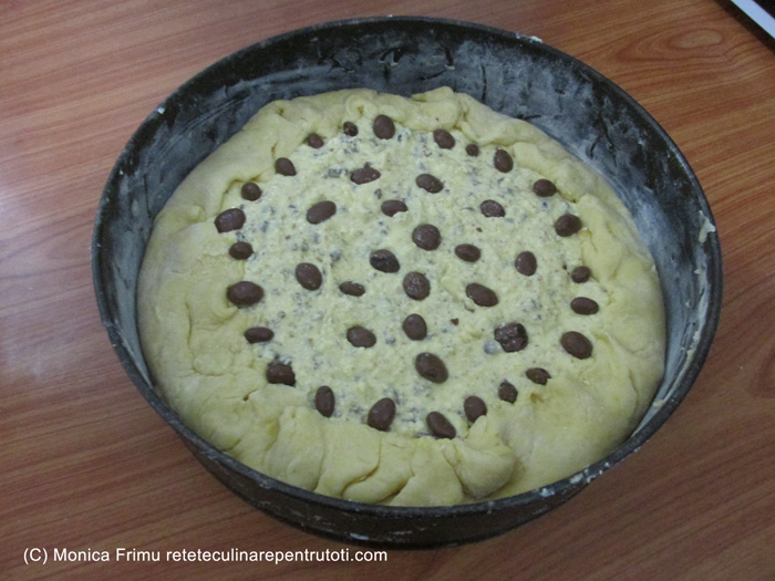 Tăiem ciocolata bucățele mici. Amestecăm brânza cu zahărul, gălbenușurile și amidonul. Topim untul, răcorim, amestecăm cu brânza, punem coaja de lămâie, vanilia Bourbon, ciocolata, stafidele și omogenizăm. Întindem peste blat și nivelăm. Marginile blatului le îndoim peste umplutură. Deasupra așezăm stafidele în ciocolată.