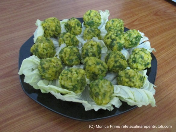 Scurgem cartofii și pasăm. Scurgem bulgurul, amestecăm cu ceapa, cartofii și sare după gust. Adăugăm frunzele tocate și omogenizăm. După ce s-a răcorit, cu o lingură luăm din compoziție și cu mâinile formăm chifteluțe. Acoperim o farfurie cu frunze de salată verde, așezăm chifteluțele și servim. Putem păstra în frigider.