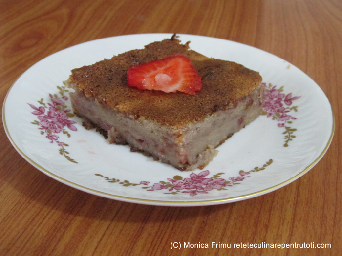 Îndepărtăm codițele și spălăm căpșunile. Tăiem ¼ și cele mai mici ½. Punem într-o cratiță, adăugăm 100 g zahăr tos, punem pe foc mic și amestecăm din când în când, aproximativ 20-25 minute, spre final continuu, până se îngroașă ca o „marmeladă”. Punem de o parte și răcim. Frecăm untul cu zahărul cu aromă de căpșuni, adăugăm gălbenușurile, făina și mixăm până devin cremoase. Punem compoziția din căpșuni și omogenizăm. Mixăm albușurile spumă tare cu un praf de sare. Încorporăm în compoziția din căpșuni amestecând ușor cu o lingură. Ungem o formă Yena cu unt, turnăm compoziția și nivelăm. Punem în cuptorul preîncălzit, la foc mediu, aproximativ 25-30 minute, până se rumenește. Răcorim 10 minute, porționăm și servim.
