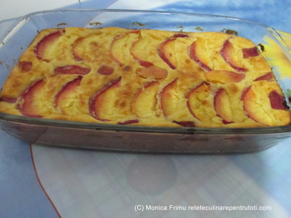 – 3 ouă, 80 g zahăr, 1 plic zahăr vanilat, 80 g gris, 500 ml lapte, 2 piersici (250 g), margarină