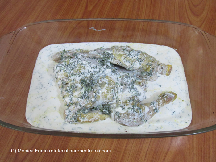 Acoperim cu folie de aluminiu și punem în cuptorul preîncălzit la foc mai mare (200) 20 minute. Îndepărtăm folia, cu o lingură turnăm frișcă peste cocoșel și punem în cuptor 5 minute. Turnăm din nou frișcă peste el și mai ținem în cuptor 5 minute. Scoatem într-un castron, turnăm frișca din Yena peste el și servim.