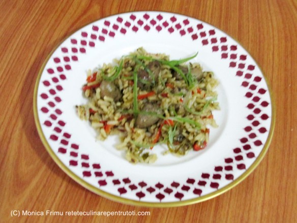 – 200 g inimioare de pui, 200 g orez brun, 2 cepe verzi, 100 g ardei gras roșu, 4 linguri sos Worcester, 2 lingurițe măghiran uscat, 2 lingurițe semințe de mărar, 3 linguri ulei, apă, sare