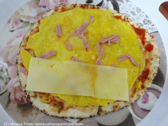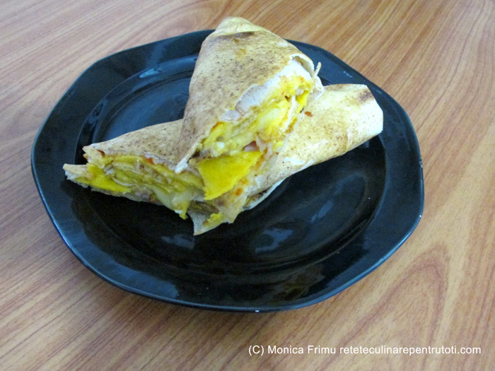 Tăiem kaiserul feliuțe. Ungem pe o parte fiecare lipie cu 1 lingură pastă de ardei și presărăm cimbrul. Vom prăji pe rând ouăle. Batem bine 2 ouă cu puțină sare. Ungem o tigaie teflonată cu ulei, încălzim pe foc mediu, turnăm ouăle astfel încât să acopere toată suprafața și prăjim până se coagulează pe partea tigăii. Așezăm peste lipie. La fel procedăm cu celelalte ouă. Deasupra punem feliuțe de kaizer. Acoperim o parte de lipie cu felii de brânză.