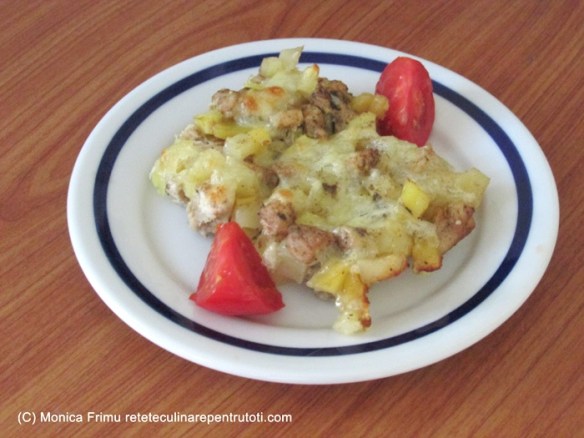 Acoperim cu folie de aluminiu și punem în cuptorul preîncălzit la foc mare (250) 40 minute. Îndepărtăm folia, presărăm pe toată suprafața mozzarella și punem în cuptor la foc mai mic (160) 5 minute. Servim imediat, opțional cu smântână.