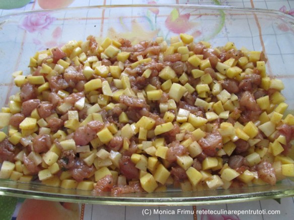 Radem mic mozzarella. Curățăm cartofii, tăiem cubulețe. Tăiem carnea cubulețe, amestecăm cu cartofii, boiaua, busuiocul, oregano, uleiul, sare și piper după gust, omogenizăm și punem într-o tavă.