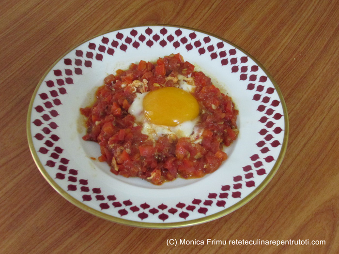 – 1 ou, 250 g roșii, 80 g ardei gras roșu, 2 căței de usturoi, ½ linguriță ardei iute roșu tăiat mărunt, ¼ linguriță boabe de coriandru, ¼ linguriță semințe de chimen, 2 lingurițe pastă de roșii, 2 linguri ulei de măsline, sare, piper, apă, opțional harissa