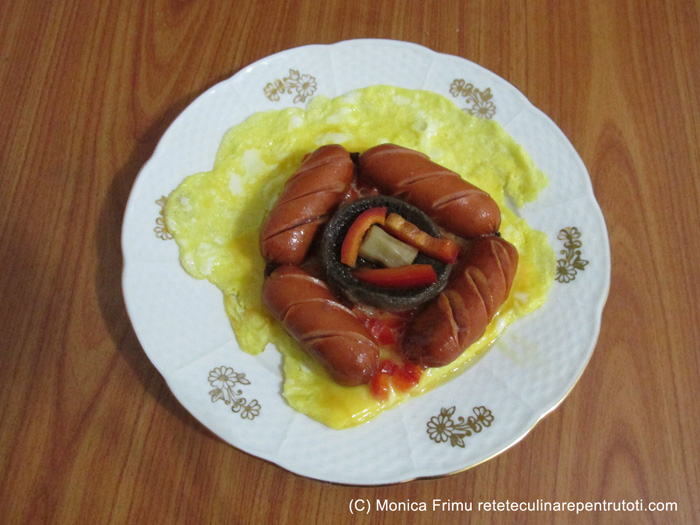 – 4 cârnați de bere, 1 ou, 1 felie de ardei capia, 1 ciupercă Campignon, 1 lingură ulei, sare