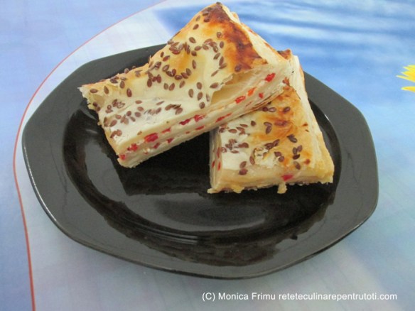 – 6 foi de aluat foietaj (1 cutie Puff Pastry-400 g), 200 g brânză Feta, 100 g ardei capia roșu, 2 linguri smântână, 2 linguri semințe de in