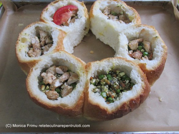 Tăiem capacul chiflelor și scobim lăsând o margine subțire. Topim margarina și ungem la exterior chiflele. Le așezăm într-o tavă tapetată cu hârtie de copt. În fiecare chiflă punem compoziție din bol, deasupra punem bucățele de carne și acoperim cu o felie de roșie. Presărăm pe ele semințe de in.