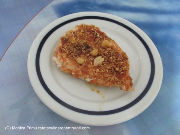 Amestecăm fulgii de cocos cu arahidele și prăjim sec. Crestăm fiecare bucată de carne ½ pe lungime obținând câte o felie pe care le ungem pe ambele părți cu 2 lingurițe de pesto și pliem. Ținem la temperatura camerei 15 minute. Încălzim o tigaie teflonată la foc mediu. Desfacem feliile de carne și prăjim la foc mai mic 3 minute. Întoarcem pe cealaltă parte, după 1 minut presărăm amestecul cu arahide pe toată suprafața și ținem pe foc încă 2 minute. Servim imediat.