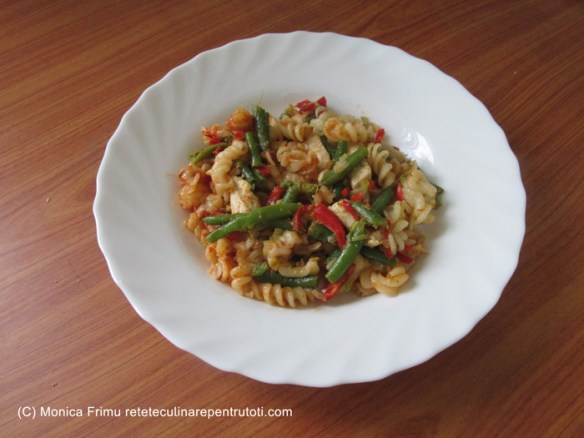 Tăiem carnea fâșii mai lungi. Curățăm și tăiem ardeiul felii, apio și ceapa mărunt. Clocotim 3 l de apă cu o linguriță de sare, punem pastele și fierbem 8 minute apoi scurgem și punem deoparte.