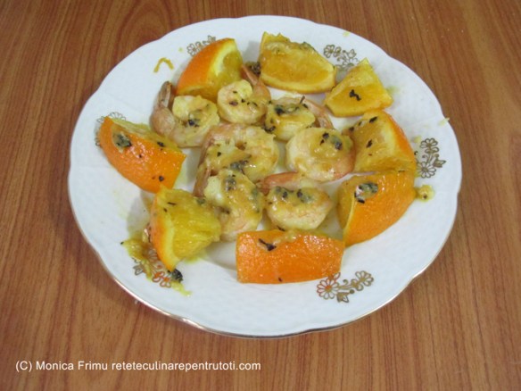 – 100 g creveți mari decorticați (codița păstrată), 1 portocală (200 g), 2 căței de usturoi, ¼ linguriță praf de ghimbir, ½ linguriță busuioc roșu, ¼ linguriță piper alb măcinat, ¼ linguriță sare de mare, 1 lingură ulei de măsline