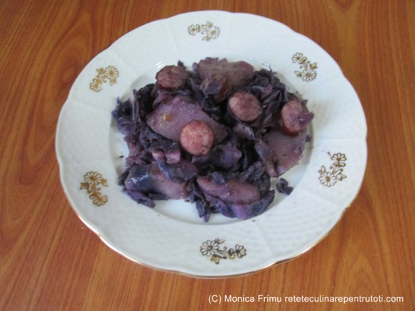 – 400 g cartofi, 250 g varză roșie, 100 g ceapă, 150 g cabanos, 1 lingură cimbru uscat, ½ linguriță piper negru măcinat, sare, 2 linguri ulei, apă