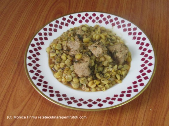 – 300 g pulpă de porc, 300 g mazăre galbenă uscată, 100 g ceapă, 2 căței de usturoi, 300 ml bulion de roșii, 2 lingurițe condimente Chimichurri, 1 linguriță chimen măcinat, 20 g mărar, 1 cub concentrat supă de legume, 3 linguri ulei, sare, piper, apă