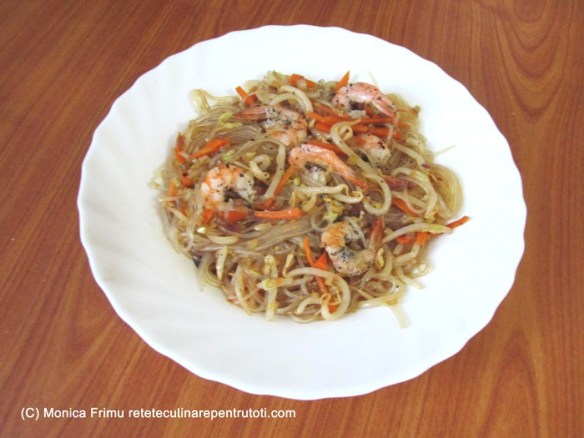 – 100 g tăiței de orez, 100 g creveți decorticați (li s-a păstrat codița), 2 căței de usturoi, 50 g ceapă roșie, 50 g morcovi, 150 g varză chinezească, 1 borcan muguri de fasole Mung (180 g net), 1 linguriță pastă de ardei iute, 1 linguriță condimente pentru pește, 2 lingurițe sos de soia, 1 linguriță sos de soia dark, 1 linguriță sos de stridii, 50 ml apă, 2 linguri ulei