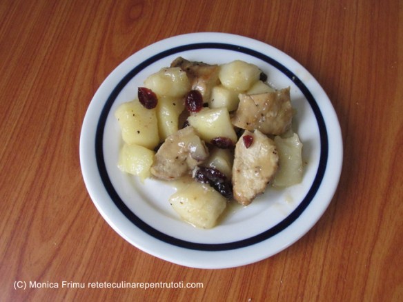 – 150 g piept de pui dezosat și fără piele, 3 pere mari, 3 linguri merișoare, 3 linguri zahăr brun, ½ lingură condimente pentru carne de pui, 1 linguriță piper negru cu lămâie măcinat, 100 ml frișcă, 2 linguri ulei, sare, apă