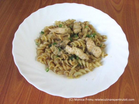 – 200 g paste făinoase fusilli, 200 g piept de pui dezosat și fără piele, 25 g ceapă verde, 100 g sos Cumberland, 1 linguriță rozmarin uscat, 2 linguri ulei, sare, piper negru măcinat, apă