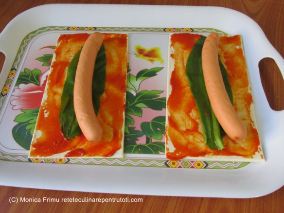 Decongelăm aluatul, ungem fiecare foaie cu pastă de ardei, așezăm la mijloc câte o frunză de leurdă, peste câte un crenvurst.