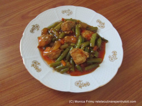 – 200 g piept de pui dezosat și fără piele, 250 g fasole verde congelată, 1 borcan sos dulce-acrișor (430 ml), 1 linguriță usturoi granulat, ½ linguriță praf de ghimbir, 3 boabe de ienibahar, 1 linguriță praf de curry exotic, 1 lingură ulei, sare