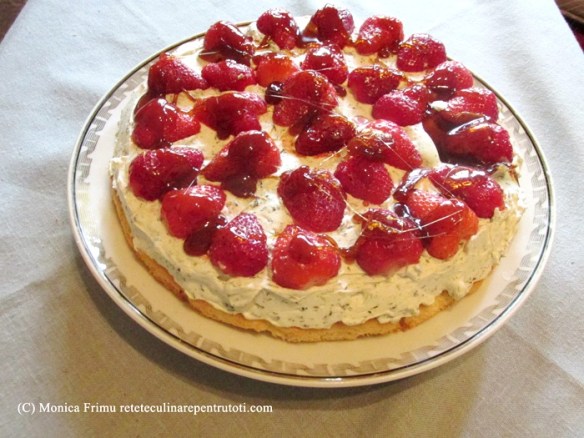 Amestecăm făina cu praful de copt. Mixăm ouăle cu un praf de sare și zahărul până devin cremoase. Adăugăm făina, omogenizăm și turnăm uniform într-o formă de tort (28 cm diametru) tapetată cu hârtie de copt. Punem în cuptorul preîncălzit la foc mediu 15-20 minute. Răcim, îndepărtăm hârtia și așezăm pe un platou. Întindem uniform crema de mentă și punem în frigider până pregătim căpșunile. Îndepărtăm codițele, spălăm căpșunile, tăiem ½ pe lungime și așezăm peste cremă. Topim zahărul pe foc mic și cu o lingură punem peste căpșuni. Ținem tarta în frigider 3 ore. Porționăm și servim.