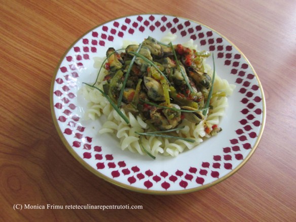 – 250 g midii fără cochilii, 50 g ceapă verde, 50 g ardei verde tăiat feliuțe, 2 linguri pastă de ardei-conservă, 1 linguriță ierburi de Provence, 1 linguriță busuioc uscat, 100 ml vin alb demisec, ¼ linguriță piper alb măcinat, ½ linguriță sare de mare, 1 lingură ulei