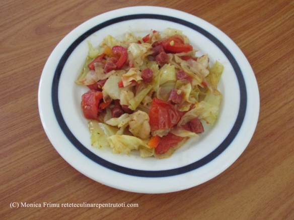 – 350 g varză dulce, 100 g ardei gras, 80 g cârnați subțiri din carne de porc și vită, 80 g ceapă, 200 g roșii mici, 1 linguriță semințe de coriandru, 1 linguriță praf de cimbru, ½ linguriță piper negru măcinat, 1 lingură ulei, sare, apă