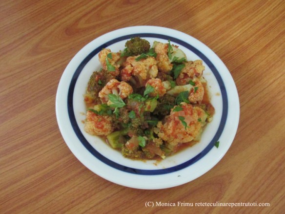 Pe foc mediu și prăjim ceapa, usturoiul 2 minute. Turnăm sucul de lime, sosul Tabasco, ketchup-ul, presărăm coaja de lămâie și aducem la punctul de fierbere. Punem conopida, broccoli, zahărul, coriandrul, sare și piper după gust. Amestecăm și fierbem 10 minute. Porționăm în farfurii, deasupra presărăm hasmațuchi/pătrunjel verde tocat grosier și servim. Putem păstra în frigider.