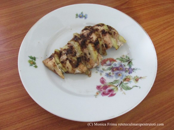 – 1 piept de pui dezosat și fără piele (500 g), 1 pară (160 g), ½ linguriță cuișoare măcinate, 1 linguriță brânză rasă pentru paste, sare, ulei