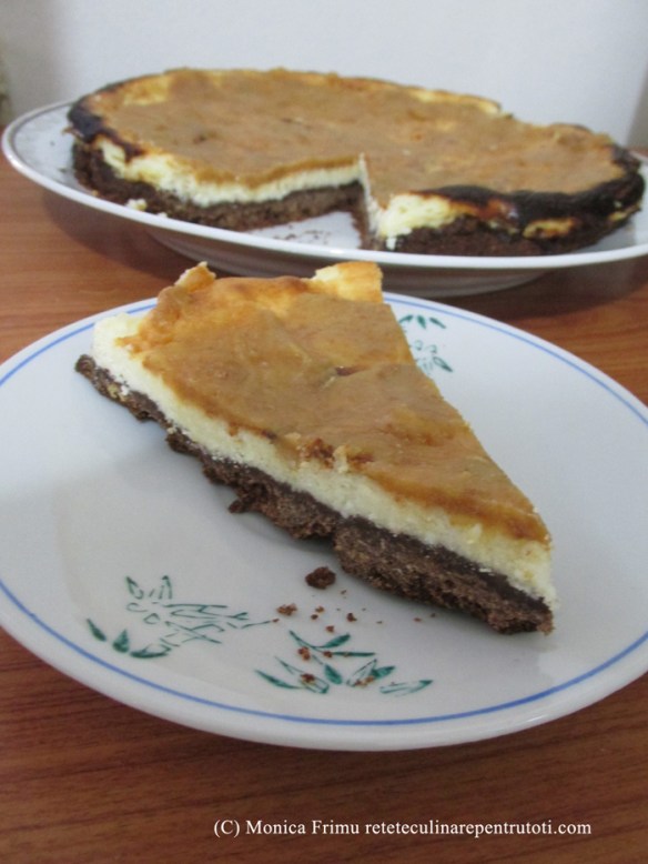 Măcinăm biscuiții, punem într-un bol și amestecăm cu cacaoa. Topim untul, turnăm peste biscuiți și omogenizăm. Într-o formă de tort tapetată cu hârtie de copt întindem biscuiții într-un strat uniform. Batem bine ouăle cu un praf de sare. Mixăm frișca tare, adăugăm zahărul și mixăm până se întărește. Adăugăm brânza, zahărul vanilat, ouăle și omogenizăm. Întindem compoziția peste biscuiți. Umplem tava cuptorului cu apă și îl încălzim la foc mediu. Pe grilajul aflat deasupra tăvii așezăm forma de tort și ținem în cuptor 40-45 minute, până se rumenește ușor. Scoatem din cuptor, răcorim 5 minute, turnăm caramelul și acoperim toată suprafața. Răcim, îndepărtăm hârtia și transferăm pe un platou. Punem în frigider 3 ore. Porționăm și servim.