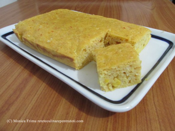 Curățăm ceapa, tăiem mărunt, călim în uleiul încins până se înmoaie și răcim. Spălăm boabele de porumb cu apă rece și scurgem. Radem mare brânza. Amestecăm făina cu mălaiul, praful de copt și zahărul. Batem bine ouăle cu un tel, adăugăm pe rând pasta de ardei, ceapa, laptele, porumbul, brânza, sare și piper după gust și omogenizăm. Adăugăm amestecul cu mălai și amestecăm până obținem un aluat omogen. Tapetăm un vas Yena cu hârtie de copt, turnăm amestecul și nivelăm. Punem în cuptorul preîncălzit la foc mai mare (200) 20 minute.