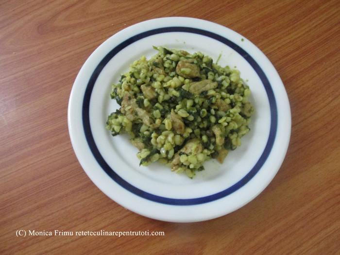 Curățăm usturoiul și tăiem mărunt. Într-o tigaie teflonată încălzim 1 lingură de ulei pe foc mediu și prăjim usturoiul 30 secunde. Punem carnea și prăjim pe toate părțile 3 minute. Adăugăm spanacul congelat, acoperim cu capac și gătim 2 minute. Punem bulgurul cu tot cu lichidul rămas, adăugăm boabele de piper, praful de curry, sare după gust, amestecăm, acoperim cu capac și fierbem până se evaporă lichidul, aproximativ 10 minute. Descoperim, turnăm bulionul și amestecăm din când în când 2 minute. Servim mâncarea caldă.