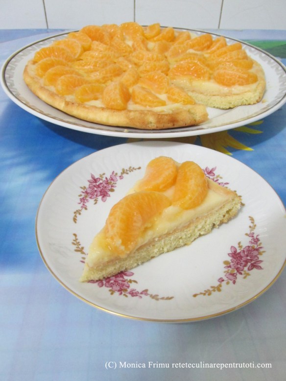 Curățăm clementinele de coajă, desfacem în felii și îndepărtăm eventualii sâmburi având grijă să nu le rupem. Topim margarina pe foc mediu, punem clementinele și amestecăm din când în când 2 minute. Presărăm zahărul brut și amestecăm din când în când până se topește, aproximativ 3-4 minute. Decorăm tarta cu feliile de clementine, deasupra turnăm siropul format. Punem în frigider 4 ore. Porționăm și servim.