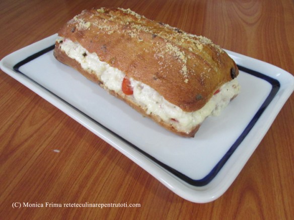 – 1 ciabatta mare (280 g), 250 g brânză telemea puțin sărată, 50 g smântână, 50 g roșii Cherry, ½ linguriță mix piper colorat zdrobit grosier, margarină, brânză rasă pentru paste