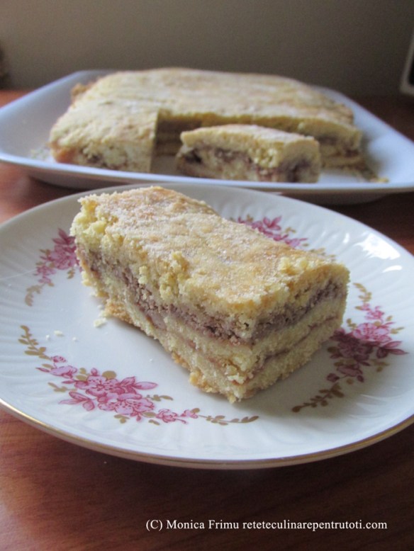 Amestecăm făina cu margarina, adăugăm 1 ou și 2 gălbenușuri, zahărul, zahărul vanilat, bicarbonatul și frământăm un aluat omogen pe care îl împărțim în trei. Pe masa de lucru presărăm făină și cu ajutorul unui făcăleț vom întinde trei foi de dimensiunea tăvii. Tapetăm tava cu hârtie de copt, punem o foaie și o ungem cu jumătate din cantitatea de gem. Așezăm a doua foaie, o ungem cu restul de gem și presărăm pe toată suprafața nucile. Acoperim cu a treia foaie. Punem în cuptorul preîncălzit la foc mediu până începe să se rumenească, aproximativ 30 minute. Scoatem din cuptor, presărăm zahărul praf vanilat sau întindem uniform glazura și răcim în tavă.