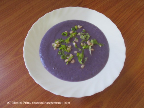 Pasăm varza, cartofii, împreună cu smântâna și puțină supă. Turnăm în restul de supă și încălzim. Porționăm, deasupra punem amestec de praz cu mușchi și servim.