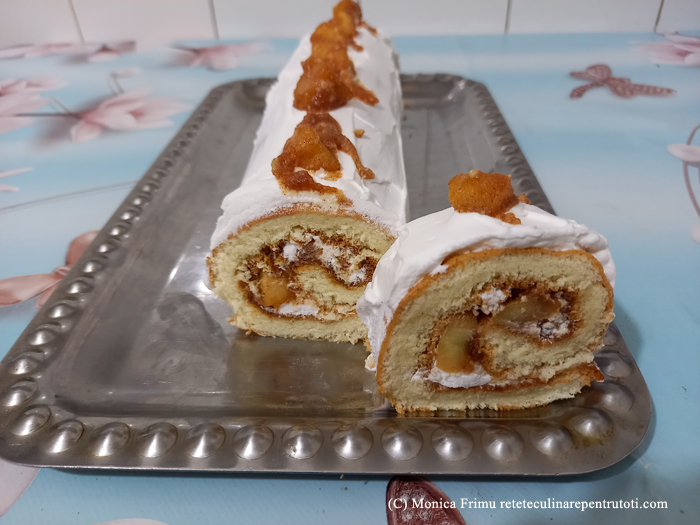 Desfacem rulada cu grijă să nu o rupem. Acoperim suprafața cu un strat de frișcă, restul punem în frigider. Punem o parte din merele cu sos, rulăm, punem iar mere și rulăm strâns. Păstrăm mere pentru decor. Așezăm rulada pe o tavă și punem în frigider 1 oră. Acoperim rulada cu frișca rămasă, ornăm cu mere caramelizate, tăiem felii și servim.