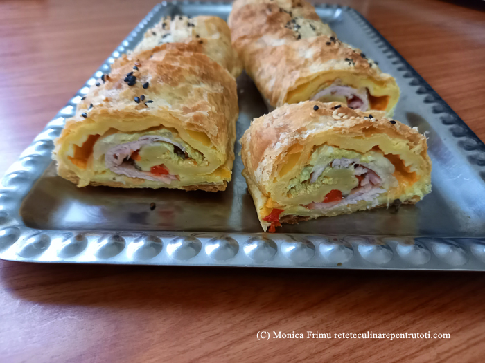Tapetăm o tavă cu hârtie de copt pe care o ungem cu puțin ulei. Tăiem ardeiul cubulețe și îl amestecăm cu salvia. Decongelăm aluatul și ungem pe o parte cu pasta de ardei. Pe mijloc așezăm, puțin suprapuse, frunzele de varză, deasupra feliile de mușchi, cu marginile suprapuse. Acoperim cu ardei și salvie. Rulăm pe lățime, ungem exteriorul cu puțin ulei și așezăm în tavă. Pe toată lungimea ruloului presărăm semințe de susan. Punem în cuptorul preîncălzit la foc mai mare (200) până se rumenește, aproximativ 20-25 minute. Servim cald sau rece, tăiat felii.