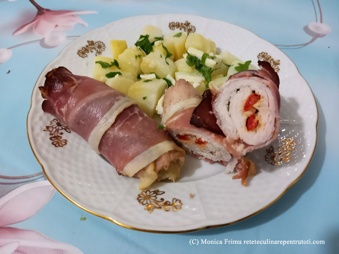 Tăiem carnea în 12 felii subțiri pe care le batem subțiri, ca pentru șnițele. Presărăm sarea, piperul, pe ambele fețe. Lăsăm să stea 30 minute. Tăiem cașcavalul în 12 bastonașe, ardeiul în 24 feliuțe. Pe fiecare felie de carne, la mijloc punem un bastonaș de cașcaval, de o parte și de cealaltă câte o feliuță de ardei. Rulăm și închidem capetele. Fiecare rulou îl învelim în 2 felii de șuncă, rulate în jurul lui. Ungem o tavă cu ulei și așezăm rulourile. Le stropim cu puțin ulei. Punem în cuptorul preîncălzit la foc mediu (180) 30 minute. Servim cu garnitură la alegere.