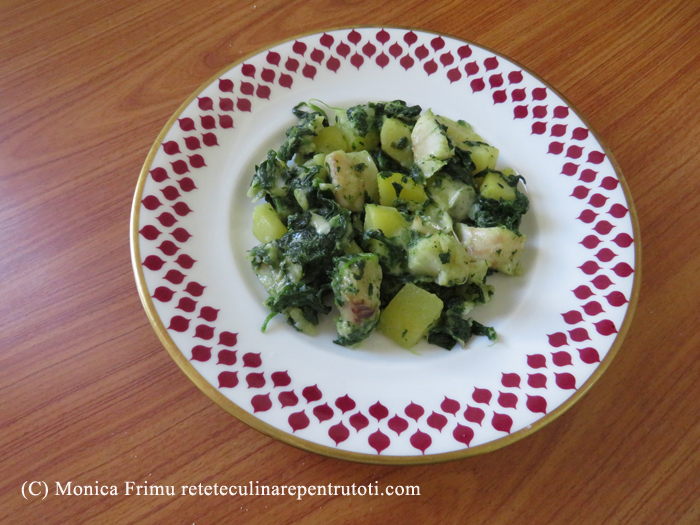Curățăm cartofii, fierbem în apă cu sare, scurgem, tăiem cuburi și amestecăm cu 1 lingură de ulei. Decongelăm spanacul și păstrăm zeama. Radem mare cașcavalul. Curățăm usturoiul și tăiem mărunt. Tăiem peștele bucăți mai mici. Într-o tigaie teflonată încălzim 1 lingură de ulei pe foc mare și prăjim usturoiul 30 secunde. Adăugăm cartofii și amestecăm 1 minut. Reducem flacăra la mediu, punem bucățile de pește, amestecăm 1 minut, adăugăm spanacul, zeama rămasă de la decongelat, rozmarinul, ½ linguriță sare, ¼ linguriță piper și amestecăm din când în când până se evaporă apa, aproximativ 4-5 minute. Stingem focul, presărăm cașcavalul și amestecăm până se topește. Porționăm și servim.
