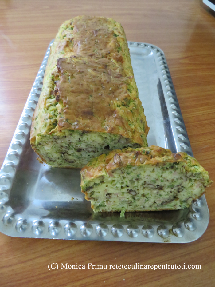 Tăiem salata și ceapa mărunt, șunca fâșii subțiri. Radem mare brânza. Tăiem nucile grosier. Amestecăm făina cu praful de copt. Mixăm ouăle cu un praf de sare până își dublează volumul. Adăugăm făina, alternând cu laptele, turnăm uleiul și omogenizăm. Încorporăm restul ingredientelor, sărăm și piperăm după gust. Tapetăm o formă de chec (30×22 cm) cu hârtie de copt și întindem uniform compoziția. Punem în cuptorul preîncălzit la foc mediu (180) 30 minute, până se rumenește. Răcim, îndepărtăm hârtia, punem pe o tavă, tăiem felii și servim. Putem păstra în frigider.