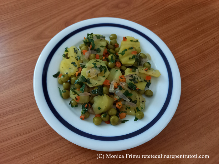 – 250 g cartofi mici, 1 conservă mazăre (net 130 g), 40 g ceapă roșie, 80 g ardei gras, 3 linguri frunze de mentă tocate mărunt, 1 linguriță boabe de piper negru, ½ linguriță sare, 1 lingură ulei, apă