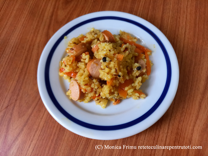 – 50 g orez cu bobul lung, 2 crenvurști de porc, 1 morcov mic (50 g), 100 g sos dulce-acrișor, 2 semințe de cardamom verde, câte ½ linguriță turmeric, semințe de chimen negru și boabe de piper negru, 2 linguri ulei, apă, sare